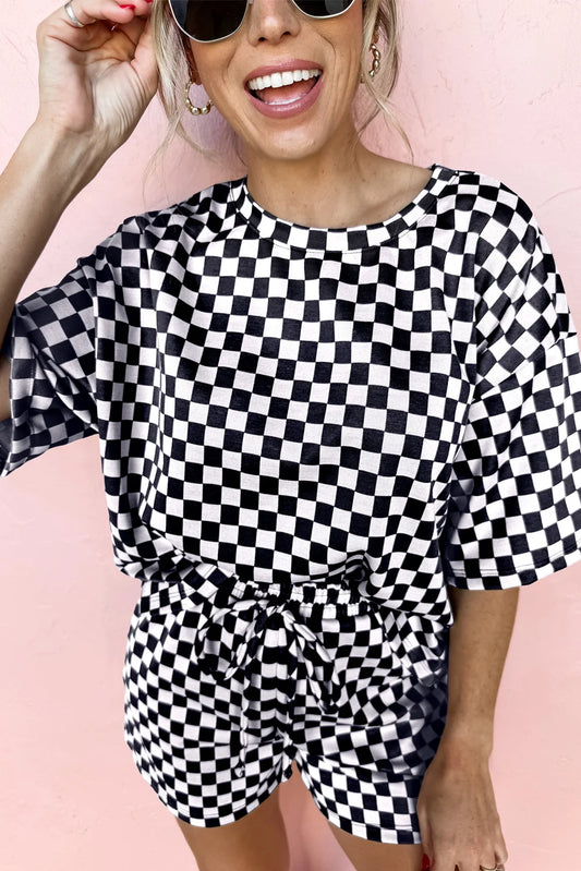 Shewin 2025 Women's Plaid Black Pink Checkered Top and Short Casual 2pcs Set
